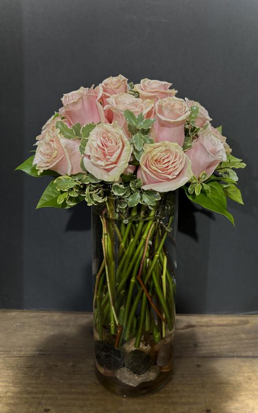 18 Soft Pink Roses in a sturdy cylinder with polished rocks at the base and a nice mix of foliage intermingled. BOLD Simplicity - LLOOVVEE